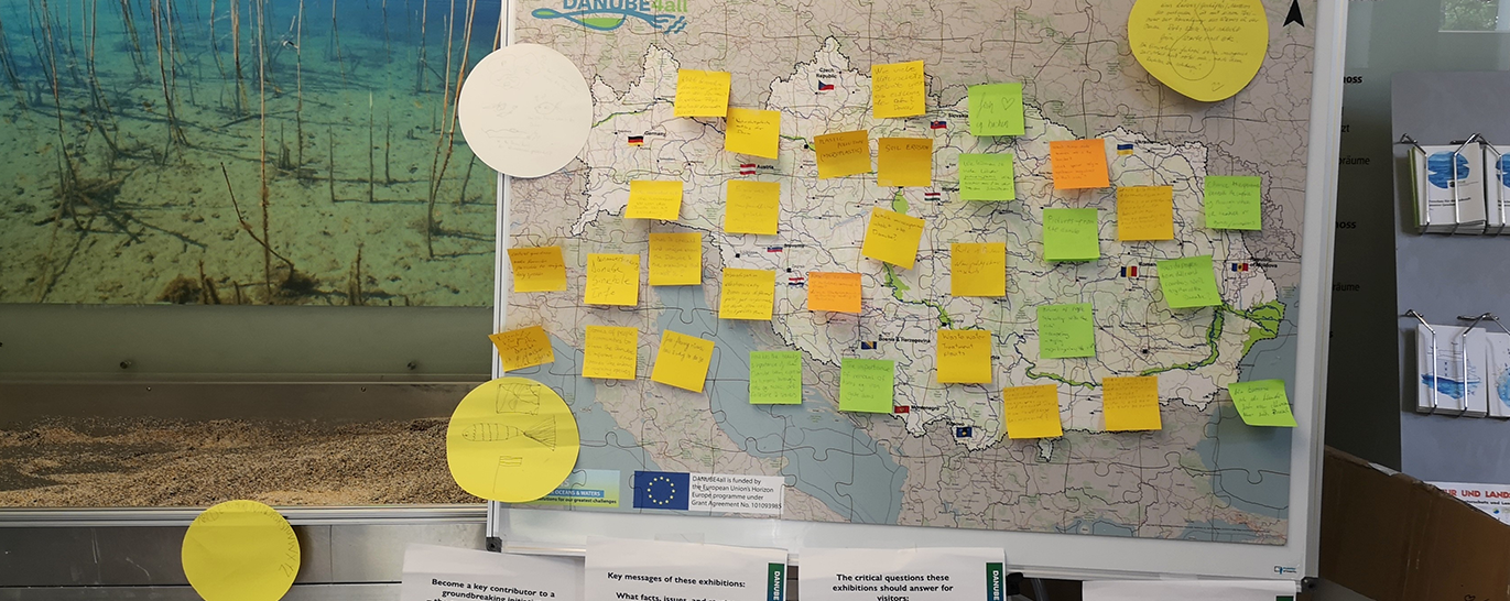 Protecting and restoring rivers and floodplains, which are affected by many different human activities, requires the active participation of stakeholders and citizens. To support this, a co-creation approach was developed to gather citizens’ suggestions for conceptualizing a traveling exhibition on the Danube River that would provide environmental education about river and floodplain management. Because we aimed to reach citizens from a variety of cultural backgrounds in several countries, we developed a poster-sized interactive and collaborative wooden jigsaw puzzle of the Danube basin. This was used as an intuitive and integrative platform for interactions among citizens and stakeholders while they assembled the 88 pieces of the puzzle, to which they added Post-it® Notes with ideas for a future traveling exhibition to each puzzle piece. The Puzzle Wall was presented at 10 sites, mostly within the Danube basin, where 527 responses were collected from over 300 participants. This large-format puzzle map proved a successful engagement tool that motivated participants to share their insights and express their preferences, hence taking collective responsibility for addressing critical challenges in Danube River management.